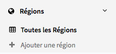 Pour accéder à la liste des Régions existantes: cliquer sur l'icône Régions du tableau de bord à gauche de la plateforme puis cliquer sur tous les Régions