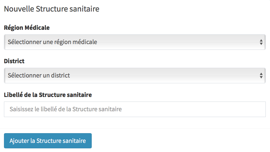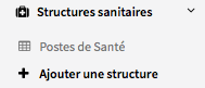 Pour ajouter une Structure sanitaire: cliquez sur l'icône plus (+) Ajouter une Structure Remplissez le formulaire qui s'affiche puis validez