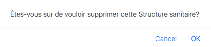 Pour supprimer une Structure sanitaire: sélectionner la Structure, cliquez sur la derniére colonne l'action suppimer. Une fenêtre s'affiche,vous validez la suppression du Structure en cliquant sur 'OK' pour valider ou cliquer sur Annuler pour annuler la suppression.