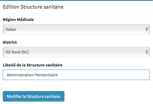 Pour modifier une Structure sanitaire: sélectionner la Structure, cliquer sur la derniére colonne l'action modifier